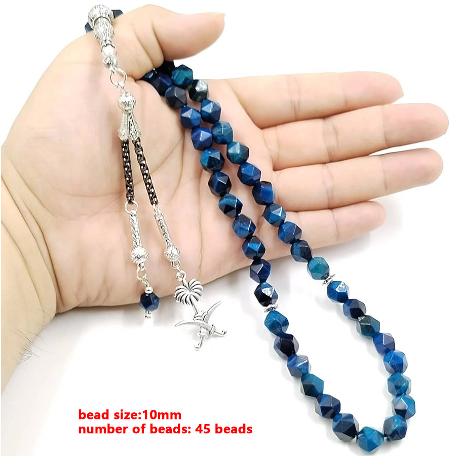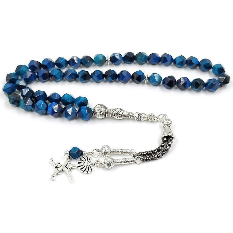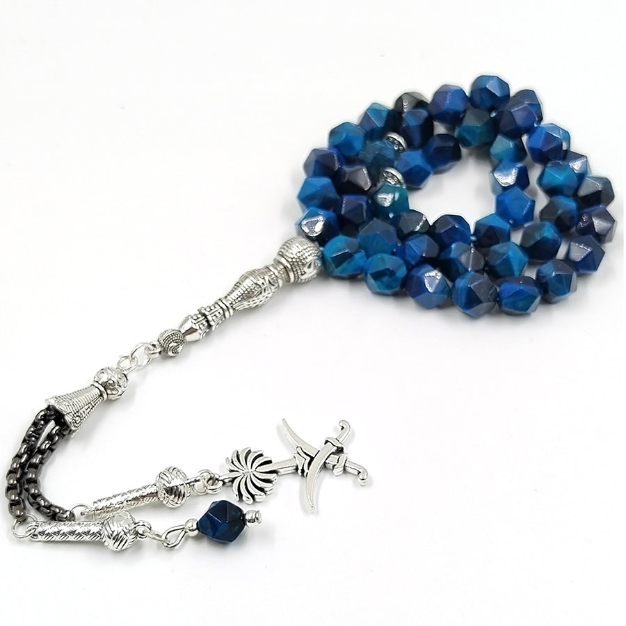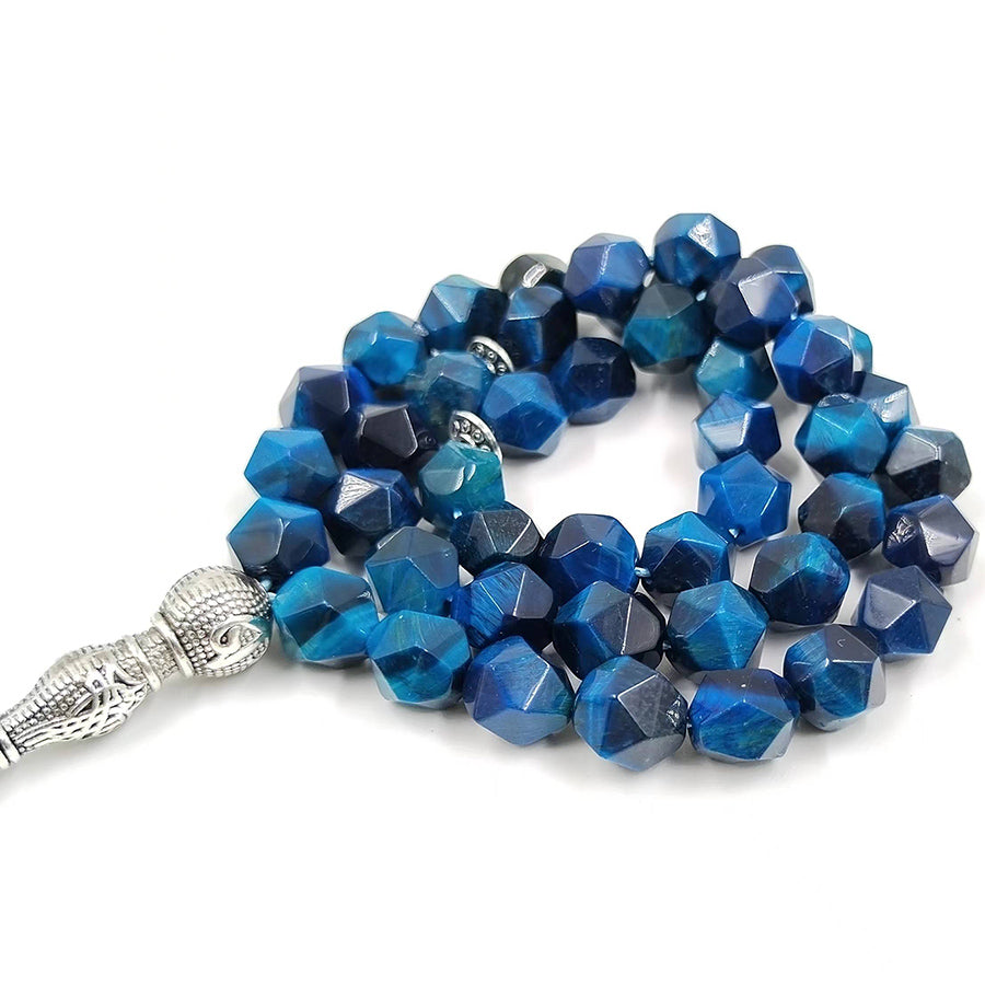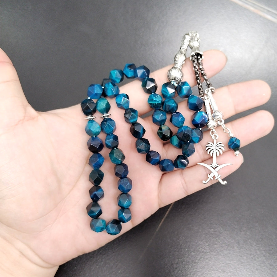 سبحة سعودية حجر عين النمر ازرق طبيعي شكله الخرز معين