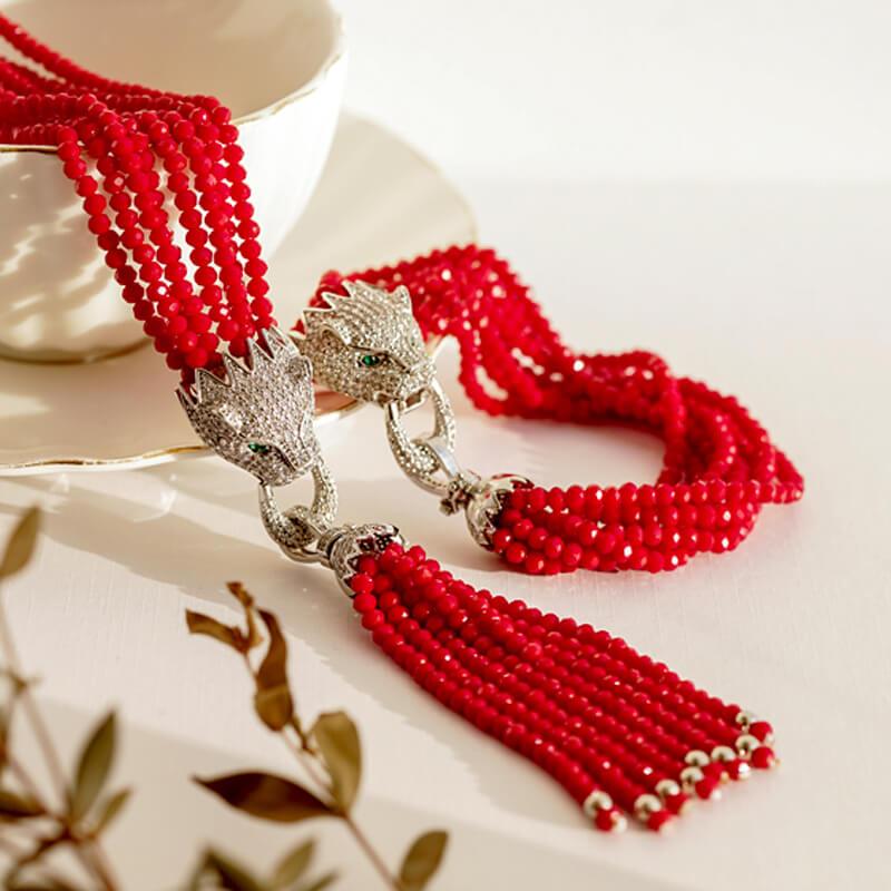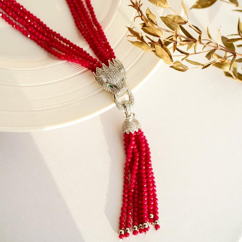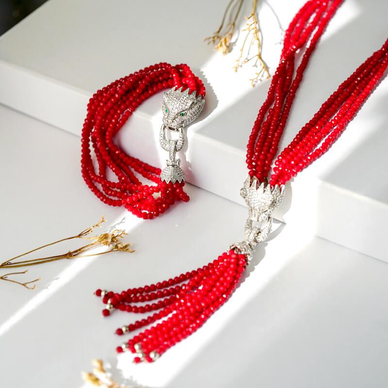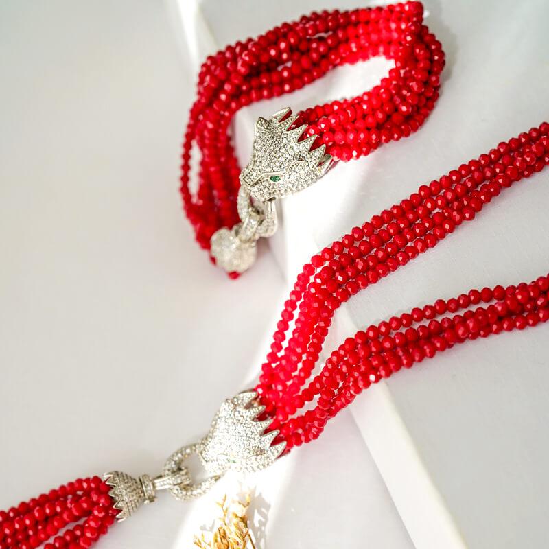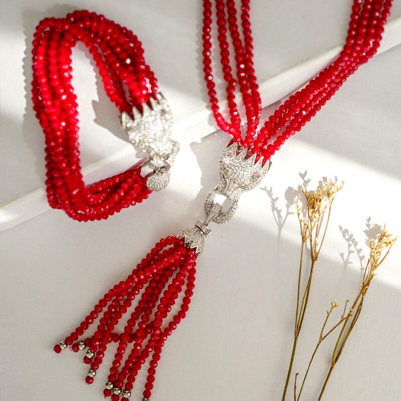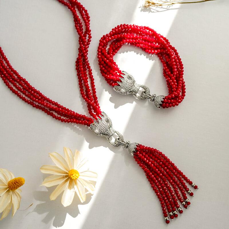 مجوهرات طقم سوار و قلادة كريستال احمر مع راس النمر